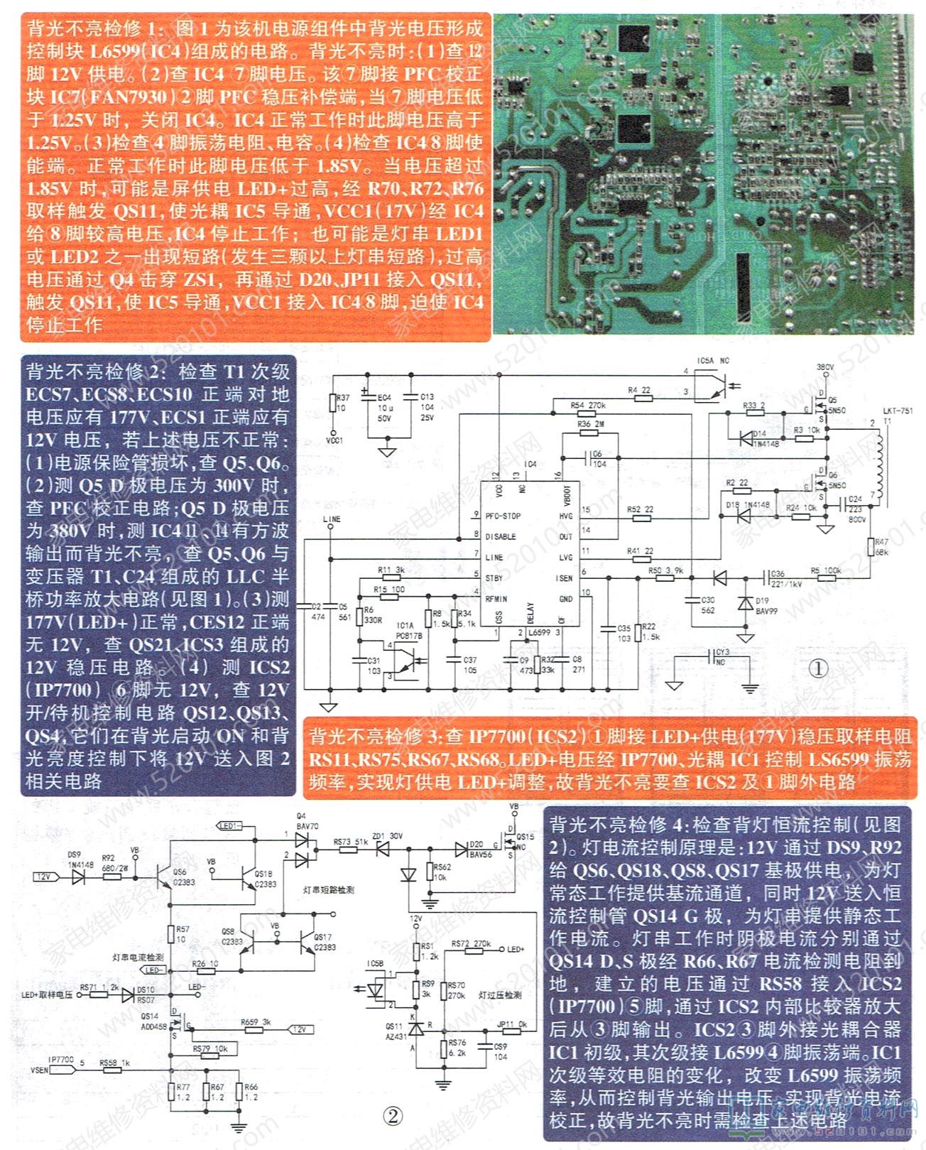 图1为该机电源组件中背光电压形成控制块L6599(IC4组成的电路。背光不亮时:(1)查2脚12V供电。(2)查IC4⑦脚电压。该⑦脚接PFC校正块IC7(FAN7930)2脚PFC稳压补偿端,当⑦脚电压低于1.25V时,关闭IC4。IC4正常工作时此脚电压高于1.25V.(3 检查④脚振荡电阻、电容。(4)检查 IC48脚使能端。正常工作时此脚电压低于1.85V。当电压超过1.85V时,可能是屏供电LED+过高,经R70、R72、R76取样触发QS11,使光耦IC5导通,VCC1(17V)经IC4给8脚较高电压,IC4停止工作;也可能是灯串LED1或LED2之一出现短路(发生三颗以上灯串短路),过高电压通过Q4击穿ZS1,再通过D20、JP11接入QS11,触发OS11,使IC5导通,VCCI接入IC4⑧脚,迫使IC4停止工作。