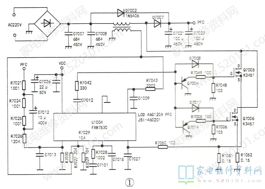 接修一台夏普LCD-46G120A型液晶彩电,三无,指示灯不亮。拆机检测, 发现保险已断,Q7004、Q7005、R7049、D7008已损坏,将以上元件全部换新,并更换U7004(FAN7530)后,在保险管处接上一只200W/220V灯泡试机,PFC电压为312V,这说明PFC电路工作异常。实绘该机PFC电路如图1所示。经查,二极管D7002( 1N5406 )击穿,换用1N5408型二极管后试机,PFC电压为383V,故障排除。