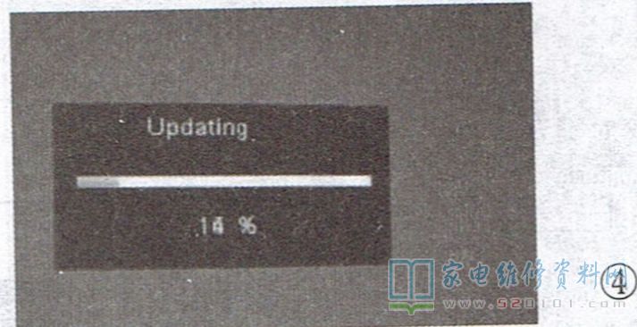 步骤5:按“▲/▼"键选择USB _UPDATE(见图3),按“”键进入升级菜单。按“4/”键选择“是”,按遥控器"OK"键确认升级软件。升级进度见图4,当显示100%时,表示升级完成。机器自动关机,并重新启动。