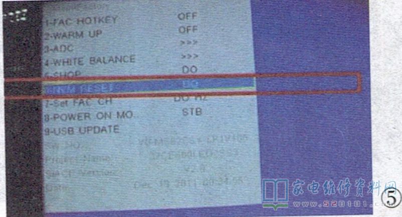 步骤6:升级完成后,按“▲/▼"键选择"NVMRESET"(见图5),按遥控器“”键,执行初始化,EEPROM数据重新复位。断掉电源,再开机,电视机进入正常工作状态,升级完成。