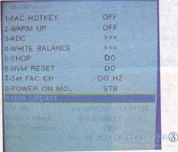 三洋43CE66OLED液晶彩电直接通过USB端口升级软件的方法如下。步骤1:首先确认升级软件BIN文件与该机机型及屏型号是否相对应。步骤2:将该二进制的BIN文件拷贝到U盘的根目录下,并将此文件重新命名为"TCL MS82 _UPDATE.bin" ,存盘。步骤3:将U盘插入机器的USB端口(见图1)。