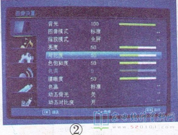 步骤4:在TV信源下,按遥控器上“菜单键”进入用户菜单,按“▲/▼”键选择“图像设置”,按“”键进入图像设置子菜单,按“▲/▼”键选择“对比度”(见图2),然后在3s内依次按遥控器数字键“6、6、0”,进入工厂调试菜单。