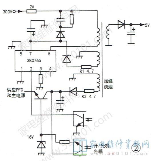 把DVD变压器和原变压器相同功能脚一一对应接好,为防止意外,用100Ω电阻代替原2A保险丝,上电测副电源辅助绕组输出电压为20V,加绕的绕阻输出电压为18V(如有偏差,可以适当调节R1、R2阻值)。另外,这两个电压还和副电源次级输出的5V负载有关,负载越重,电压越高,所以待机时这两个电压不宜超过20V。否则,开机后输出电压升高,会引起供应PFC和主电源的稳压三极管功耗过高。检查无识后通电试机,故障排除。