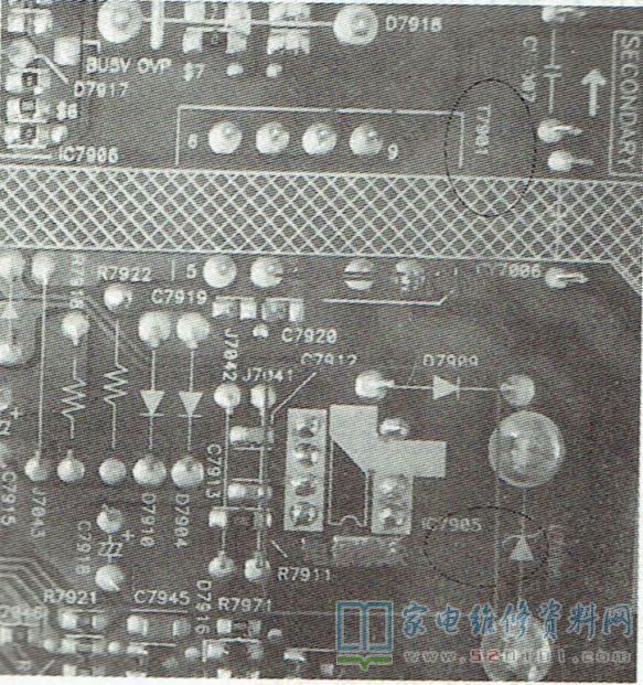 该机待机电源电路由IC7905和变压器T7901及周围元件组成,如图1所示,输出5V为主板供电。根据故障现象,判断故障原因是待机电源个别元件不良,导致输出功率降低,从而出现启动关机故障;当主板停止工作后,由于5V负载减轻,待机5V电压又恢复到5V正常,从而又自动重启。试换IC7905后,故障排除。