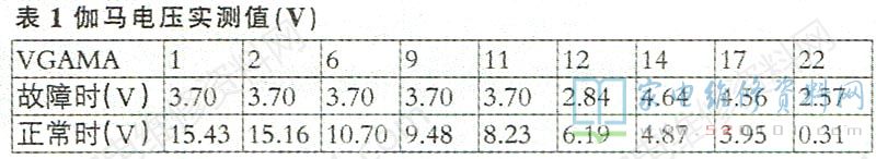 接修一台索尼KLV-32V300A型液晶彩电, 开机后伴音正常,图像暗淡,对比度差,如图1所示。上电,测得逻辑板(型号:T315XW02 VE CB)的关键点电压:VGL=-6.20V,VGH=26.94V,AVDD-16.70V, VCOM2=6.46V,COMF2=6.45V;伽马电压(逻辑板上只找到9个测试点)的实测值见表1,明显异常。伽马电压来自U8 ( AS34-G),手摸U8很烫,判断U8已损坏。将U8换新后试机,故障排除。