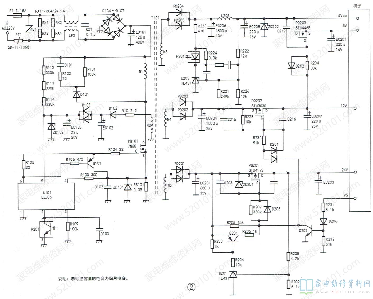 冷端N3绕组产生的感应电压经过PD204、PD205整流和EC206、EC208滤波后,产生5Vsb待机直流电压。N4 绕组产生的感应电压经过PD202、PD203整流和EC204滤波后,产生12V直流电压。N5绕组产生的感应电压经PD201整流和EC201滤波后,产生24V直流电压。当某种原因使5Vsb、12V电压升高时,取样电阻R226两端的电压升高,即U203(TL431)的R极电压升高,则U203的K极电压下降,光耦P201中的发光二极管发光增强,则P201③、④脚间光敏三极管导通电阻减小,U101②脚电压下降,在u101内部电路的控制下,⑥脚输出脉冲的占空比下降,则输出电压下降,达到稳压的目的。若5Vsb、12V电压下降,其稳压过程与上述相反。