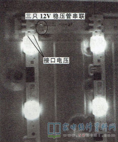 用数字万用表二极管挡检测第七根灯条上的12只灯珠,均可正常点亮;测该灯条接口处电压为14.32V,明显异常。该接口外接12V和24V两只稳压二极管(两者串联),测量发现12V稳压二极管击穿,24V稳压二极管的正反向阻值也不正常。拆下这两只稳压二极管,用3只12V稳压二极管串联代替,如图1所示。上电试机,故障排除。