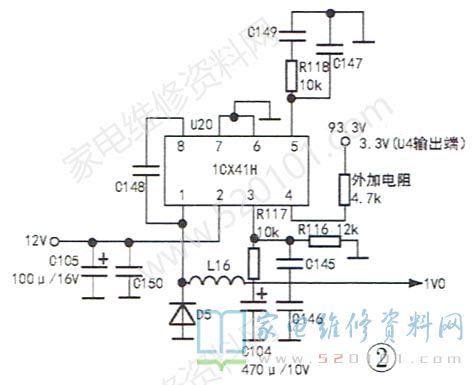 因为故障时背光亮,屏上显示一幅静止的花屏图片,所以怀疑主芯片MT8223的核心供电有问题,从而引起工作混乱。主芯片的电压有3组:3V3是供应模拟电路的,1V2由三端线性稳压器供应(故障率较低),1V0是由U20从12V变换得到。U20是一只8脚贴片芯片,型号为1CX41H(完整型号应是PQ1CX41H)。在正常工作时,测U20各脚电压,发现只要表笔一接触④脚,故障就马上出现。按实物画出这部分电路,如图2所示。