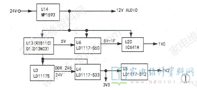 故障出现时,测主板发出的POWON信号为高电平(正常),电源板输出的STB3.3V和24V电压都正常(本机电源板只有这两组电压输出),判断故障点在主板上。该机主板供电框图如图1所示,测各组输出电压正常且稳定。因为每次冷开机可以工作-段时间,初步怀疑有元件变质,温度升高后出现故障。冷机时用吹风机给主板加热,然后再开机,发现连续工作30min故障也不出现,但关机后等机器完全冷却后再开机,故障又重现。