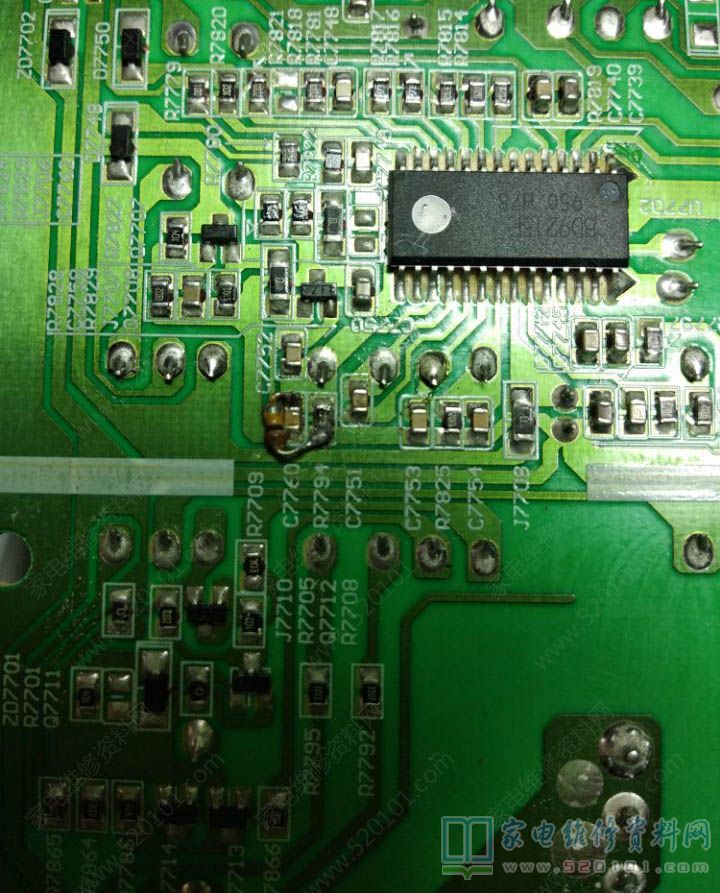 夏普LCD-46G100A液晶电视自动关机的故障维修 2022-10-25 05:41:34 阅读 986 次 评论 0 条 摘要: 接修一台夏普LCD-46G100A液晶电视,故障表现为插电红色指示灯亮,二次开机后,蓝灯亮,图声正常,4-5分钟后黑屏有声,然后又有图,然后又黑屏,三次后,待机红灯亮,为待机状态。按照网上老师们的方法, 接修一台夏普LCD-46G100A液晶电视,故障表现为插电红色指示灯亮,二次开机后,蓝灯亮,图声正常,4-5分钟后黑屏有声,然后又有图,然后又黑屏,三次后,待机红灯亮,为待机状态。按照网上老师们的方法,在R7794(82K)上并一支100K电阻后,试机正常。 版权声明:本文为转载文章,版权归原作者所有,欢迎分享本文,转载请保留出处! 点赞 分享: PREVIOUS:创维5800-A8K860-1P20主板开机困难的故障维修 NEXT:液晶电视逻辑板电路分析及故障检修 文章导航