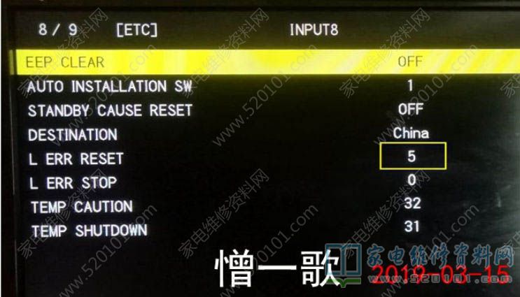 1、先按住(音量-)与(视频)键,插上交流电(强制开机)。2、强制开机屏不亮,初判背光坏,拆屏测4条灯有一条断路,测开关背光电压无,强制开机背光电压有马上下降,基本确定单独背光灯条坏,更换灯条完成通电还三无绿灯亮。3、再强制开机有图像进入了K模式,同时按(音量-)与(频道-)键,进入工厂菜单1/9 [ETC]。按向下键选到工厂菜单8/9 [ETC] INPUT8 (输入8页),然后接频道键选到L ERR RESET,按确认键后面5变成0交流关机后,再重新开机一切正常。