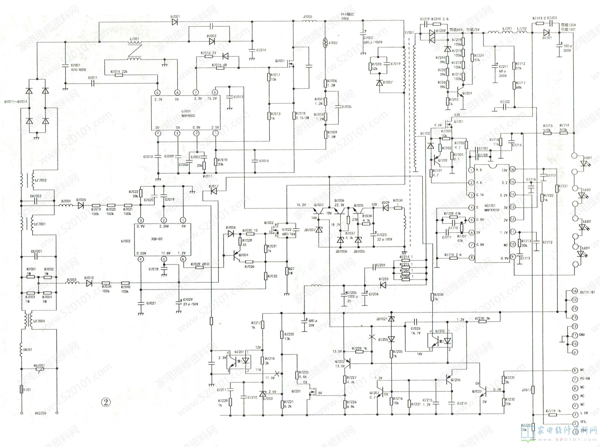 通电后测得主开关电源输出的电压(C7211上的电压)是75V,高于正常值(65V),说明后面的负载可能开路;D7701负极输出的电压是150V,也高于正常值( 120V),由此判断后面的LED灯串开路。