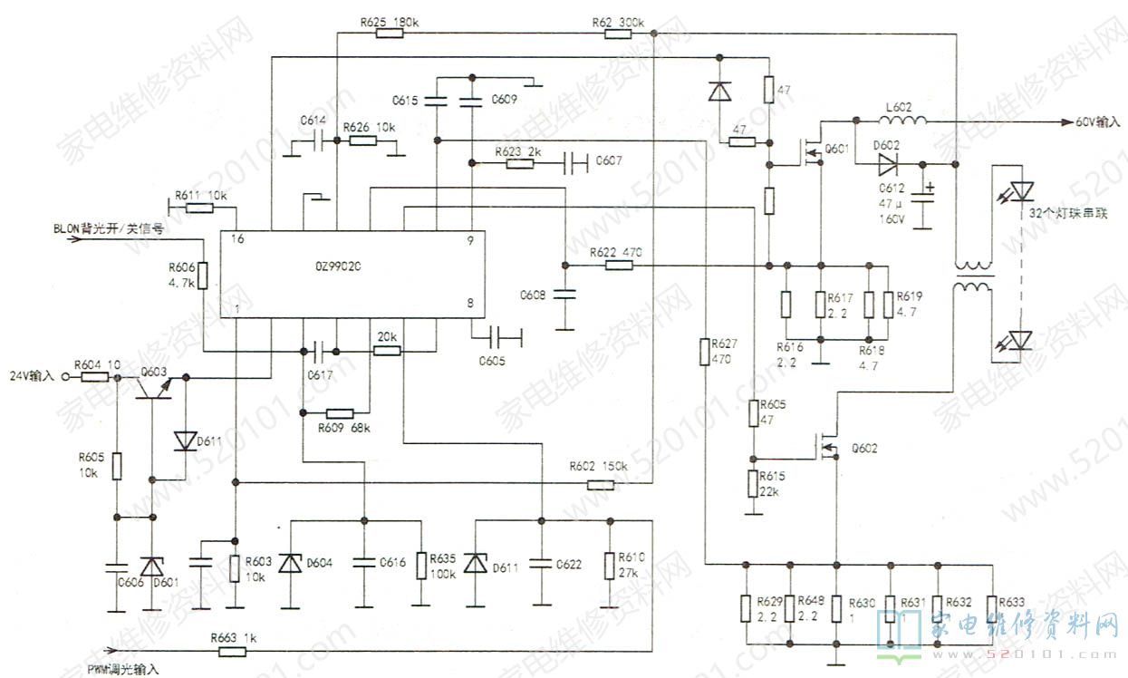 一台先锋LED-39B300液晶电视,有声无光,开机时背光会闪一下,但时间极短。该机实绘背光板电路如图1所示,其工作原理大致是:从电源板输出的24V直流电压,经Q603降压成12V后为背光控制芯片OZ9902C提供工作电压,当其③脚(背光开启信号BLON)为高电平时(3V), 芯片开始工作,通过15脚输出驱动脉冲至Q601控制栅极,将60V电压提升后为LED供电,①脚和13脚分别是LED灯供电电压的欠压和过压保护检测端,其中R602、R603 取样电压送至①脚,该脚电压<3V芯片进行欠压保护;R624/625和R626取样电压则加至13脚,该脚电压>3V芯片进行过压保护。Q601的S极与“地”之间的4只并联电阻组成电流取样取样信号经R622送芯片12脚,该脚电压>0.5V芯片进行过流保护。Q602是LED灯珠恒流控制管,S极与“地”之间的6只并联电阻对灯珠电流进行取样,取样信号经R627送至芯片10脚进行恒流控制,恒流值和S极并联电阻阻值成反比。