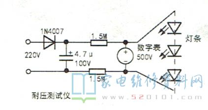 OZ9902C的⑥脚是调光控制(正常电压为2.9V),⑦脚是脉冲或电压调光方式的选择控制脚(正常电压为3.4V), 该脚如果接高电平,则LED发光亮度和⑥脚的脉冲占空比成正比,⑦脚如果接低电平,LED发光亮度和⑥脚的直流电压成正比,本机采用脉冲调光方式,因此⑦脚通过R608接④脚基准电压(正常电压为5V)为高电平。根据本例故障现象,初步判断背光板由于某种原因产生了保护,经查,发现在二次开机后13脚电压快速上升到3V左右,这说明芯片过压保护了,三个原因可以引起过压保护,-是R624、R625或线路板存在漏电现象;二是R626阻值变大;三是LED供电电压升高。其中C612.上的电压是个关键测试点,这个电压并不是一个恒定的电压,它和LED亮度有关,亮度降低该电压会升高,如果LED灯条存在开路情况,该电压会大幅度.上升,这将引起0Z9902的13脚(正常电压1.09V )取样电压>3V而进行过压保护。从上取样电阻R624、R625和分压电阻R626阻值的比例以及芯片13脚的过压保护启动阈值,推算出过压保护时灯条供电电压为140V左右,根据这一依据,检测发现上电时C612二端电压先是上升到140V,然后又回到60V,说明确实是该电压太高引起了保护,产生这一现象的原因只有一种,那就是灯条有开路情况,用自制耐压测试仪(电路如图2所示)检测灯条发现灯条两端电压是120V左右,且不稳定,小心拆开屏体发现该灯条是由32个灯珠串联而成,用数字万用表红表笔接灯珠+,黑表笔接灯珠一,,逐个检测灯珠都是好的,至此感觉有些茫然,供应电压远超灯条点亮电压(灯条估算电压32个灯珠 x 3V= 96V),为何灯条不能正常工作呢?仔细观察发现灯珠4个组成一排,共8排,排与排之间用接插线连接,是否接插件接触不良影响灯条工作呢,把所有接插件拔下来清理插座的插针,再把插头用老虎钳夹一下,重新插好再用测试仪测一下,灯珠全部发光(由于电流很小,发光较暗),电压下降到85V,上电开机灯条发光正常,灯条两端电压90V,故障排除。