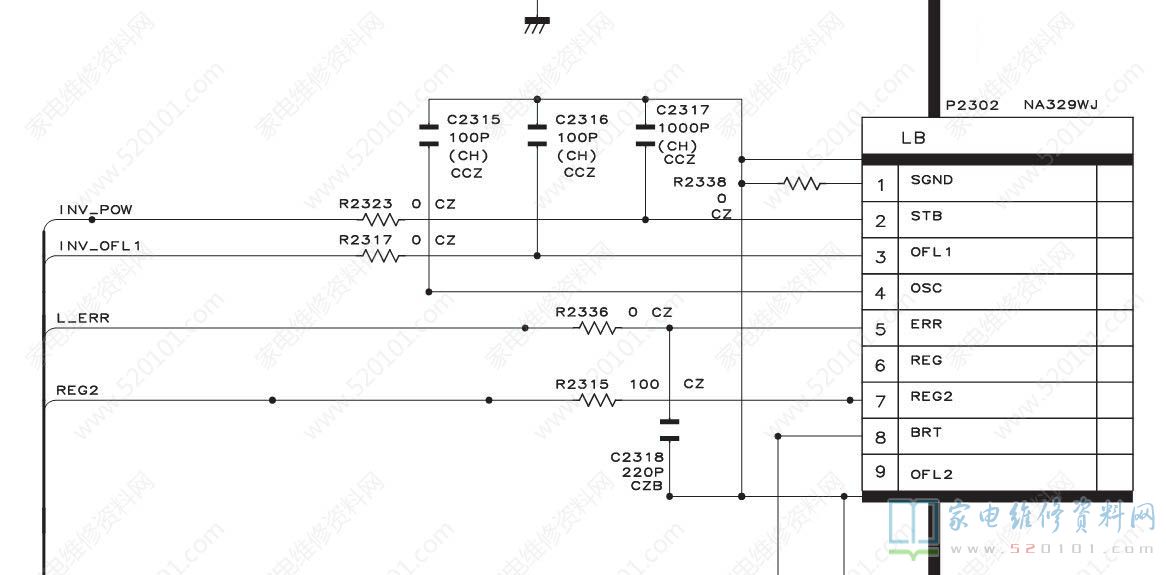 之前也修过几例该机型绿灯黑屏,一般都是主板的0欧电阻开路或阻值增大造成的,这是夏普早期机型的通病,查看夏普LCD-46GE5A图纸,看图,STB(INV_POW)走线,应该是R2323或R3109不良,夏普的主板实物上没有标注位号,只有跟着引线找,R2323正常,再找R3109时,过孔到主板背面,却找不到下面的出处在哪里,只有一个独立的过孔孤立在那里,原来主板是双层板,去R3109的线路在板的夹层中走了,眼睛都看花了,不找了,决定从电源板给逻辑板供电的12V中分压给STB,用10K、15K各1只分压取中间引线通往背光板的2脚,通电OK,进入项目调整背光大小,背光亮度调节有变化,说明确实是STB电路断开了。试机老化数小时,一切正常,故障修复。