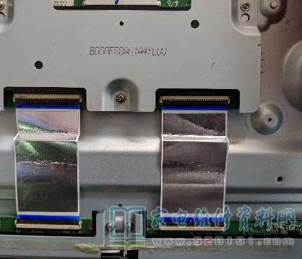 接修一台松下TH-50AS600C液晶电视,客户拿来说看的过程中黑屏了,有声音。第二天拆开来检查,背光灯亮的,逻辑板VGH只有0.9V、VGL-7V,断开右边排线后左边屏正常,测量右边边板VGH和VGL短路了,只有88Ω,边板上的电容简单测量了一下,没发现有短路的,打电话给客户说是屏坏了,报价后同意修,拆屏边框后看到有耳朵的,心想很大可能可以修复,把右边最下面一个耳朵撕掉后,插电试机,屏亮了,有图像了,插上信号线后发现图像不正常,上面四分之三图像黄,会拖尾,关机后把上面三个耳朵撕掉后图像正常了。
