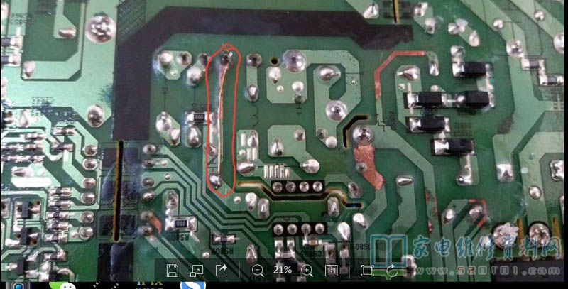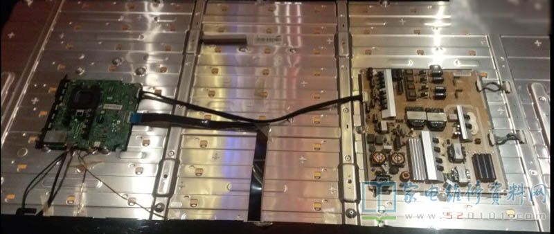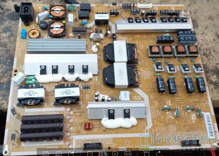 接修一客户电话说家里三星UA75F6400AJ电视打不开了。上门查看通电指示灯能亮,按遥控开机后指示灯开始闪,但屏幕一点反应都没有,还能听到里面有继电器的吸合释放的声音,反反复复。开机检测待机5.2v非常稳定。大电容有300V,主电源全部0V,很明显是PFC电路没工作,继续断电检测大件和保险都没坏,只能跟客户谈好维修价钱带回家修了,一到家马上就上维修台,检测到PFC芯片没有供电顺藤摸瓜查到是线路板铜箔被腐蚀断了,用漆包线接上后通电试机,大电容就有395V了,主电源也都正常输出了,故障修复。