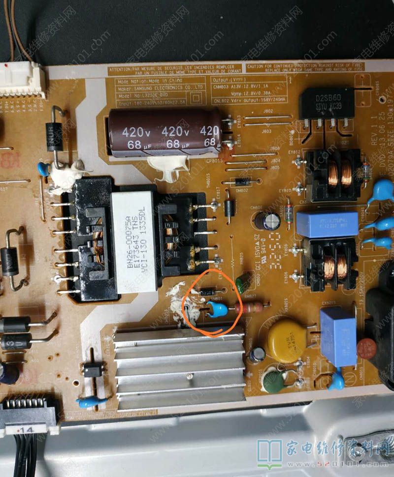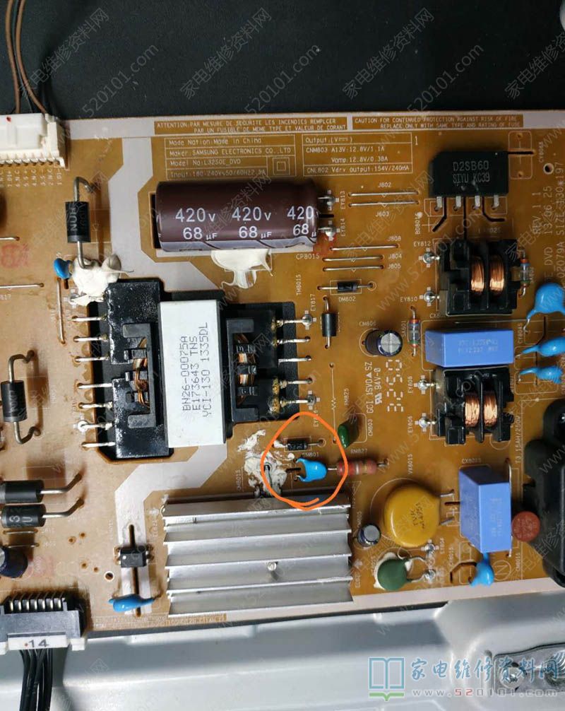 三星UA32F4088AP液晶电视开机三无的通病故障维修 2022-11-28 01:52:29 阅读 996 次 评论 0 条 摘要: 近日本人已经连续检修数台三星UA32F4088AP液晶电视,故障表现为开机三无,此类故障的原因均为图中一瓷片电容短路造成,由于该电容由于上面涂胶不易被发现,请同行们注意。 近日本人已经连续检修数台三星UA32F4088AP液晶电视,故障表现为开机三无,此类故障的原因均为图中一瓷片电容短路造成,由于该电容由于上面涂胶不易被发现,请同行们注意。 版权声明:本文为转载文章,版权归原作者所有,欢迎分享本文,转载请保留出处! 点赞 分享: PREVIOUS:液晶电视背光电路采用MP3398A芯片降低电流的方法 NEXT:AOC冠捷LE24H07F液晶电视不开机的故障维修 文章导航