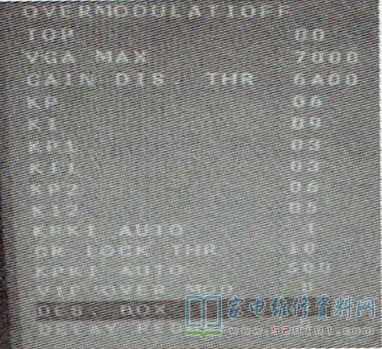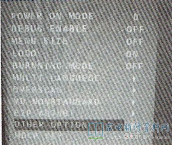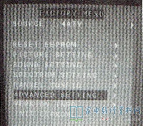 此故障的原因是机器设置有问题,解决方法如下:在TV信号源下,按遥控器上的菜单键,在屏上显示菜单期间,迅速按遥控器上的数字键1、1、4、7即可出现工厂菜单,如图2所示,选择"ADVANCED SETTING"一项并打开,进入下一页菜单,如图3所示,选择“OTHER OPTION"一项并打开,将“DES.BOX"一项的值改为“1" ,如图4所示,然后直接关断电视机电源再上电开机,不要进行复位操作,而是进行自动选台操作即可。