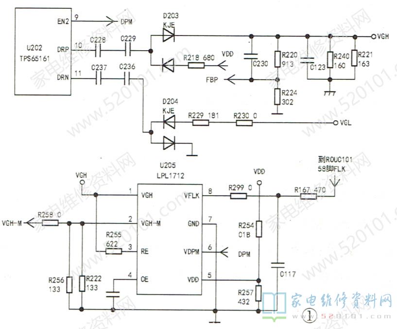 为了弄清VGH与VGH-M之间的关系,实绘出相关电路,如图1所示。测量U205(LDL1712)各脚电压如下:①脚,26.6V;②脚,2.4V;3脚,9.36V;④脚,3.56V;⑤脚(VDD端),8.5V;⑥脚,3.0V;⑦脚(地),0V;⑧脚,0.6V。因没有正常数据对照,无法确定上述测量数据是否正常。断电,对U205周边的元件进行检测,VDD电压经电阻R254及R257分压后送往U205的⑤脚,测量发现R254及R257与其标示的阻值明显不一致,R254标示“01B",即1k,测其阻值已增至4.3k;R257标示为“432”, 即4.3k,实测已增至5.6k,另外,U205的⑧脚(VFLK端)外接0Ω贴片电阻R299已开路。更换上述三只贴片电阻后开机,VGH-M电压为20.7V,此时屏幕,上图像正常,这时测U205各脚电压如下:①脚,23.7V;②脚,20.7V;③脚,6.65V;④脚,6.01V;⑤脚,12.5V ;⑥脚,3.0V;⑦脚(地),0V;⑧脚,1.97V。逻辑板上关键点电压如下:vGH为23.7V,VGH-M为20.7V,VGL为-6.04V,VDD为15.08V,VCC为3.3V。