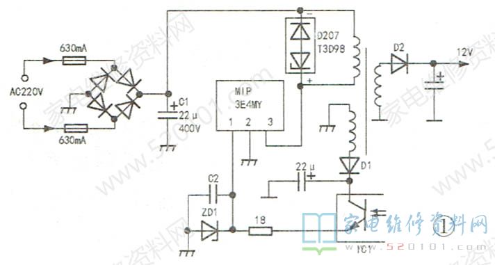 接修一台松下TH-P46U20C等离子彩电,上电后面板指示灯不亮,无法开机。根据故障现象分析,判断副电源电路有问题。该机副电源芯片采用MIP3E4MY组成,如图1所示。测副电源没有12V电压输出,负载也没有短路情况, 630mA保险丝已烧断。测C1两端充放电正常,桥堆正反向电阻也正常,这说明短路点在其他地方。仔细观察后发现电源芯片的散热片下部发黑,经查芯片②、③脚间有打火痕迹,这应是保险丝烧断的原因。