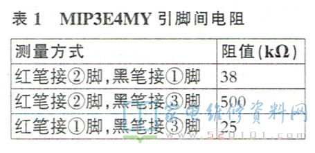 值得一提的是,D207(CT3D98)是一只复合二极管,其正反向电阻均为无穷大。用耐压测试仪测得D207正向耐压为160V,反向耐压为800V。在开关管截止期间,当D207+端电压超过460V时,D207导通,使开关管承受的反向电压不超过460V。另外,电源芯片MIP3E4MY可用TOP202直接代换,由于后者在轻载时稳压性能稍差,因此代换后要在12V电压输出端和地之间接一只1kΩ的负载用MF368指针式万用表Rx1k挡测得MIP3E4MY引脚间电阻见表1。