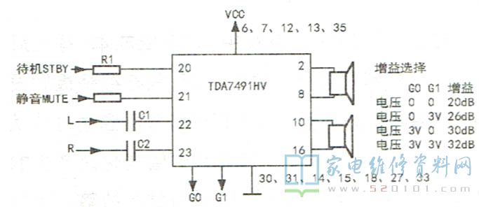 先拆去R2,把20、21脚相连,以解除静音控制,再将音频左、右声道信号从音频输入端口改接到C1、C2左端,音量大小由机顶盒控制。如此改动后试机发现,音量控制很不理想,音量为“1”时声音太大,为“0”时又无声,这说明功放芯片增益太高,有两个方法可以解决此问题:一是把音 频信号分压后再送入功放,二是降低功放芯片的增益。该芯片通过30和31脚不同的电压组合可以得到4种增益,原机30脚接地,31脚接3.3V,增益设定为26dB,现在把30脚和31脚都接地,增益降为20dB,经实验效果满意。