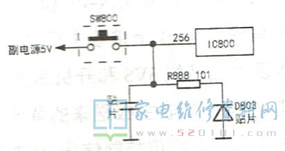 接修一台LG 32LH20R-6A液晶电视,故障表现未电源红灯亮(正常开机后,红灯变为蓝灯),按遥控器和面板上的所有按键均不起作用。先检测副开关电源输出的街机5V电压,正常且稳定;注电源输出的24V、12V电压均为0V,说明故障范围可能在主电源或CPU的开/待机电路、复位电路,或CPU。测量主电源的L6599D(PWM控制)的12脚及L6562A(PFC控制)的⑧脚供电为0V,这说明主板未发出开机指令。在顺着主板上的排线插座P201的③脚标注POWER-ON(电源开/关)查找,发现CPU(位号是IC800,型号是LGE3765A-LF-S)的开/待机端是256脚。CPU输出的POWER-ON信号送给贴片三极管Q100的b极(正常电压为1V),实测该脚电压为0V,说明此管已截止,使后面几级开关管和光耦截止,则L6599D和L6562A无16V供电电压,从而导致主电源无24V、12V输出。检查Q100及后几级开/待机电路,均无故障,则故障的范围缩小到CPU及外围电路上。检查发现在CPU附近有一只位号为SW800的微动开关,如图1所示,根据以往的维修经验,此类开关易漏电损坏。