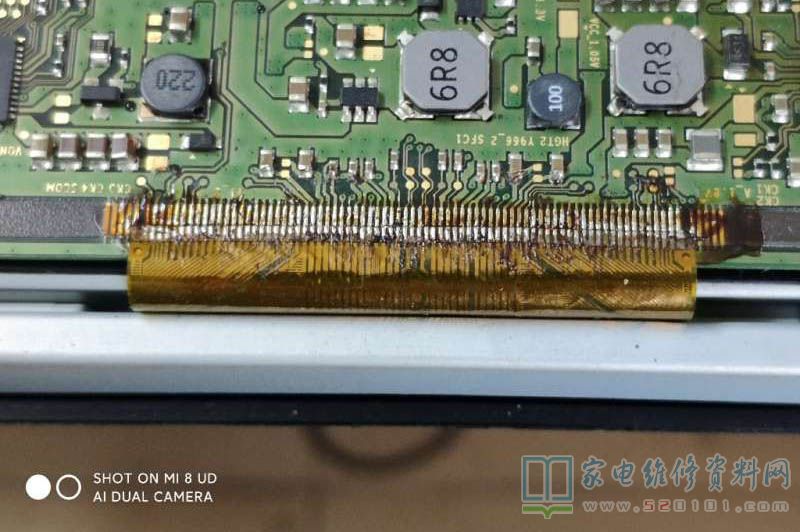 由于左右边板相连未采用扣件,而是直接压接的,断左右试机犯了难,碰运气啰!先处理副边板,未割铜箔,加热挑起模块部分电极线(挑哪里?多少根?就不说了,到处都能查到),还是灰屏,关键点电压还是没有,又挑起主边板部分电极线,涛声依旧,这时两边都挑起了,VGH、VGL等还是没有,一激灵,这个灰屏不会是逻辑板坏了,跟玻璃无关吧?一阵后悔,应该先在开机瞬间测量下VGH等电压的,如是保护应该有电压跳变一下的,下意识认为这个16Y屏玻璃很会坏的,没去想逻辑板故障,不过貌似影响不大,因为对于我来说,不管是玻璃问题还是逻辑板问题,都不是容易处理的,怀疑主芯片出问题,可是凭我的技术修复此板可能性不大,再说两边的电极线都挑了(这个不是问题,挑断的部分折一下能焊好),干脆来个大手术-换边板。