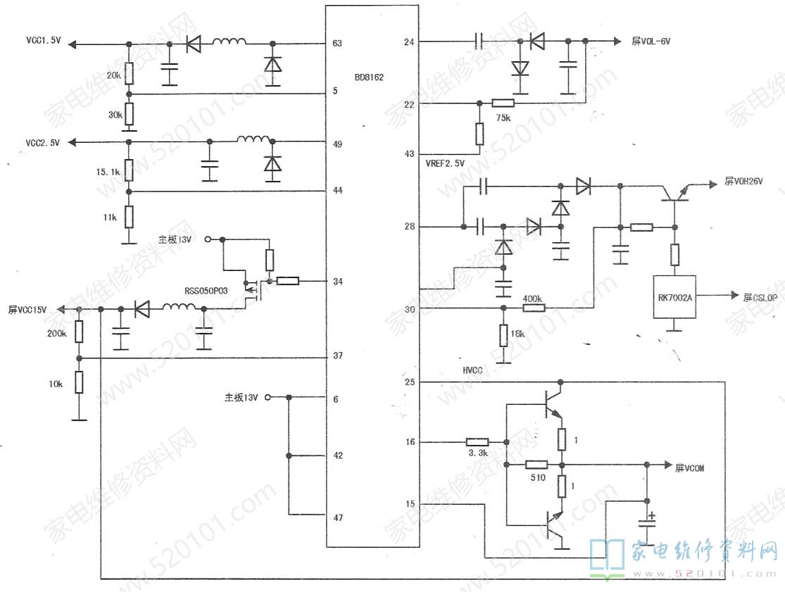 此外,单独测屏体两边15V电压端对地电阻完全一样,外加15V电压时有一个很大的充电电流(>400mA),这应是上百万个屏体场效应管的充电电流,所以BD8162控制的15V电压产生电路功率也较大。附BD8162屏供电部分引脚外围电路如图3所示。