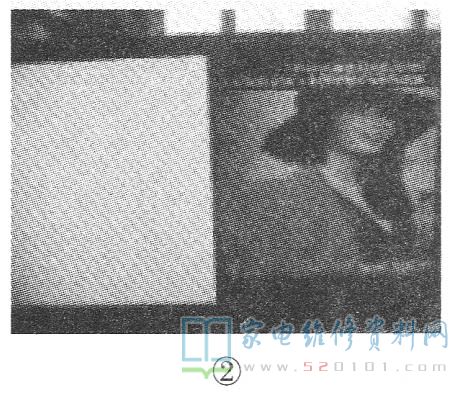 屏体上方有两块线路板,结构很对称,尝试只插一根扁线开机,屏幕右边图像正常,左边白屏如图2所示。插另一根扁线开机,原来有图像的一半变为白屏,原来白屏的一半为暗屏,无图像,说明上屏电压和信号都正常,左边屏驱动电路有问题。测屏体上方对称的两条线路板滤波电容两端的电阻,发现好的一组有一只电容正向阻值为无穷大、反向阻值为15kΩ,坏的一组正向阻值为15kΩ、反向阻值为5kΩ。让好的一半屏工作,测得该电容对地电压为-6V,这应是屏体场效应管关断电压(VLOFF)。测负荷电流有40mA(确实过大,正常时仅几个毫安),尝试外加一个-6V电压后开机,15V电压正常,屏幕上有浮雕一样的模糊图像,无法收看。
