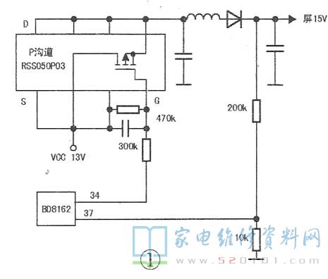 接修一台夏普LCD37A33型液晶电视,屏幕有暗光,无图像,有声音,遥控键控都正常。开盖观察,背光已点亮,从现象分析电源背光、信号处理、控制系统等都正常,检修目标在上屏电压、上屏信号等屏幕正常工作条件是否满足。仔细观察,发现该机无逻辑板,逻辑板功能已集成在主板上。主板和屏体由2根扁线连接,屏体所需的各种电压由主板上的BD8162控制产生,扁线插座有几个脚连接于较宽的线路条,估计应是屏体供电线路(后来知道是屏15V工作电压)。查该线路连接到一个开关电源,绘出局部电路如图1所示,监测该点电压,发现开机时电压上升一下就消失了;测滤波电容两端并无短路,拔去2根扁线开机,该点电压稳定在15V,接一只50Ω假负载仍很稳定,估计问题在屏体。