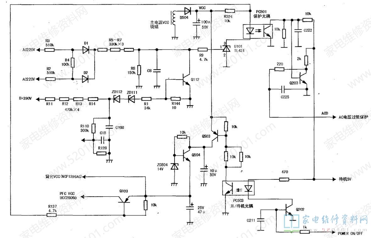 该机电源待机灯亮,二次开机电源灯闪烁几次后返回待机状态,无声无光。客户反映该机以前是不定时自动关机,现在根本不能开机。开盖,测电源板POWER ON脚,二次开机时有3.5V高电平,几秒后变低电平。该电源与背光为一体板,主电源芯片为NCP1207A,PFC芯片为UCC28060,背光芯片为NCP1396AG,按实物画出有关电路如图1所示。