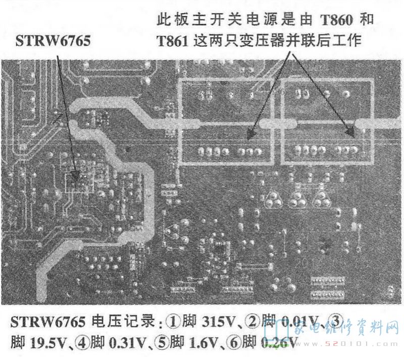 Q880正常时各脚电压:①脚315V;②脚0.01V;③脚19.5V ;④脚0.31V ;⑤脚1.6V;⑥脚电压为0.26V。