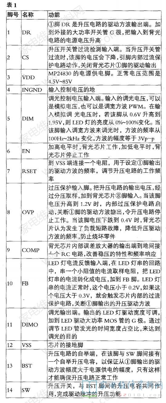 电路图见图2。MP24830引脚名称和功能见表1。值得注意的是:LED的亮度调节并不是通过调节输出电压高低来实现,而是通过调节LED亮暗占空比来实现的,就是说,LED是交替亮暗的,这个交替频率高,人眼无法分辨出来,通过调节在一个周期中亮的时间和暗的时间比来达到调节整体亮度。