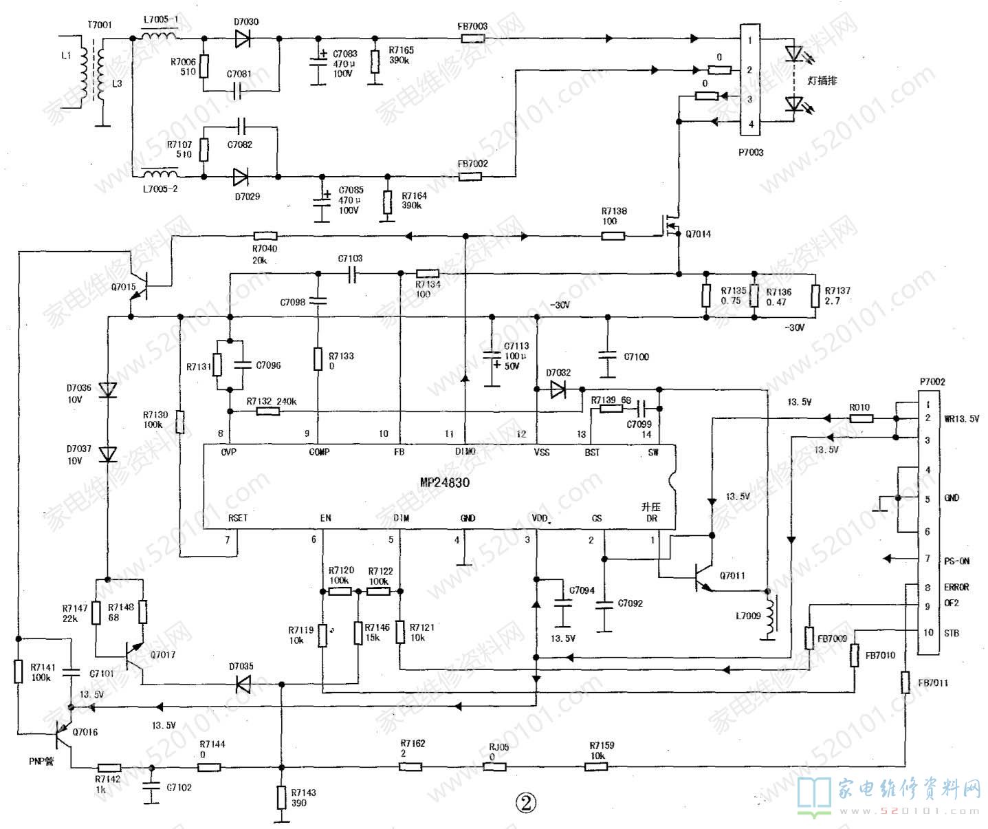 主开关电源变压器T7001产生的UR13.5V电源电压,一路直接加到MP24830的③脚作为VDD供电,另一路经过FB7005(0.1Ω电流取样电阻)加到升压开关管Q7011的D极及芯片的过流检测输入端②脚CS端。