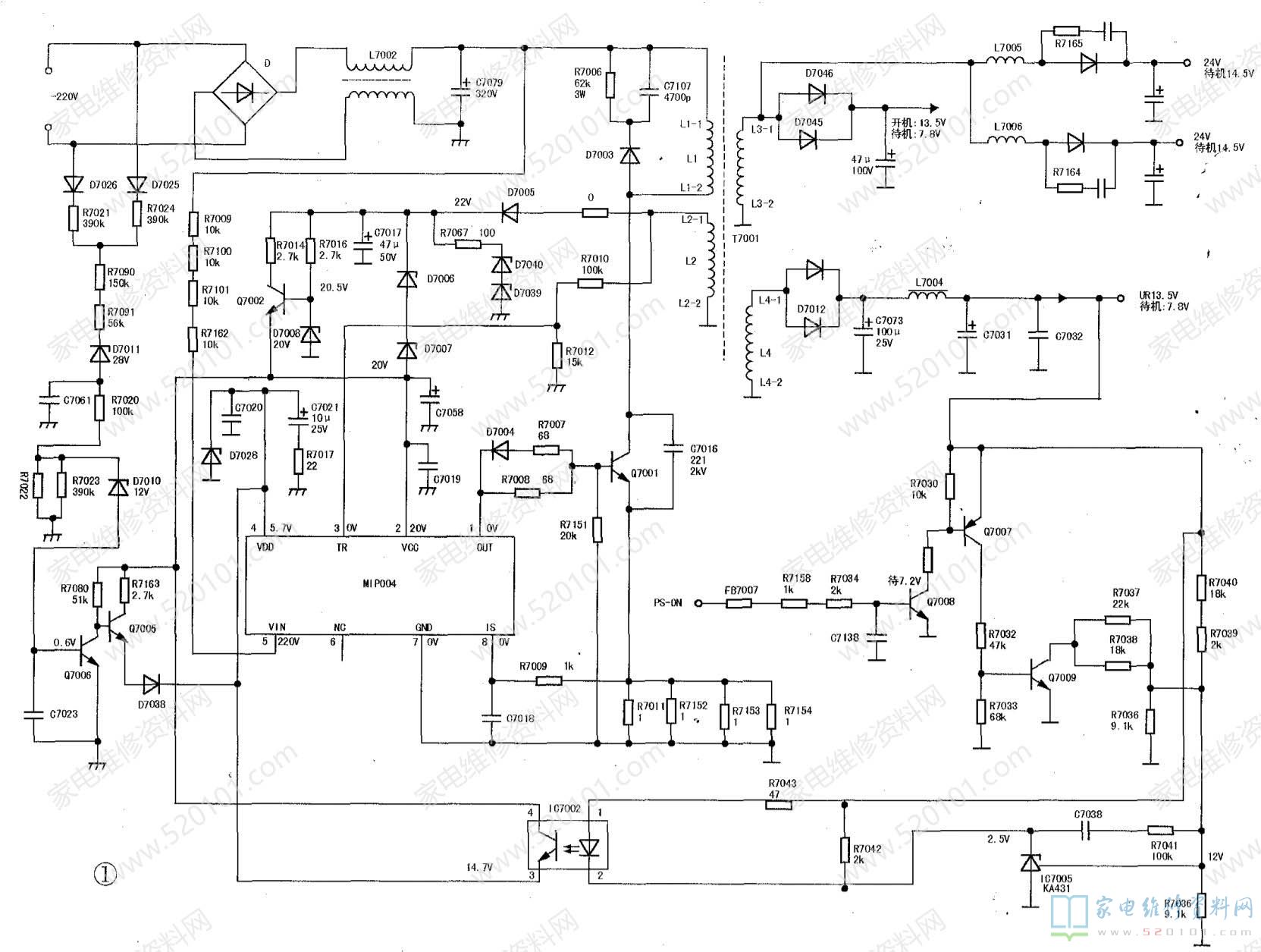 电路见图1所示。主开关电源芯片MIPO04各引脚功能;⑤脚;振荡启动电压输入端。AC220V整流滤波成300V后经大阻值电阻限流降压加到此脚,经IC内部恒流源为IC启动振荡供电。因为串联的限流电阻阻值大,使此启动电路供给的电能很小,仅能维持芯片振荡1s左右。如果芯片②脚不能得到来自外部电路更大的电能供电,仅凭⑤脚输入的启动电压,IC会处在微弱的间歇振荡状态。正常工作时,⑤脚电压为320V。②脚:在开关电源没有启动工作前,由⑤脚提供启动电压加到②脚内部振荡电路,开关电源因此得以启动振荡。开关电源进入正常工作状态后,开关电源变压器辅助绕组产生的感应电压经整流后得到20V,加到②脚为振荡电路提供足够的供电,使芯片持续工作。正常工作时②脚电压为20V。④脚:有两个功能,一是开关电源的误差电压输入端,一是开关电源AC检测电路产生的保护电压也加到该脚。当220V市电电压下降到100V以下时,为了防止开关电源管过流损坏,此时把高电平加到④脚关闭振荡。④脚正常电压为5.7V。①脚:开关管驱动脉冲输出接大功率MOS开关管的G极,实测是OV。⑧脚:开关管过流检测输入端。大功率MOS开关管S极到地一般串联一只0.25Ω的电流取样电阻,在其上产生的压降加到⑧脚,当开关管过流时⑧脚的输入电压会升高,触发IC内部的过流保护电路动作,关闭开关电源的振荡,以防止烧坏零件。⑧脚正常为0V。⑦脚:接地。③脚:开关管导通触发输入端。与开关电源变压器的辅助绕组相连,当MIP004芯片的①脚输出正脉冲电压时,MOS开关管导通,+300V电压经开关变压器的初级绕组和开关管的D-S到地,该电流把市电的电能储存到开关变压器中。