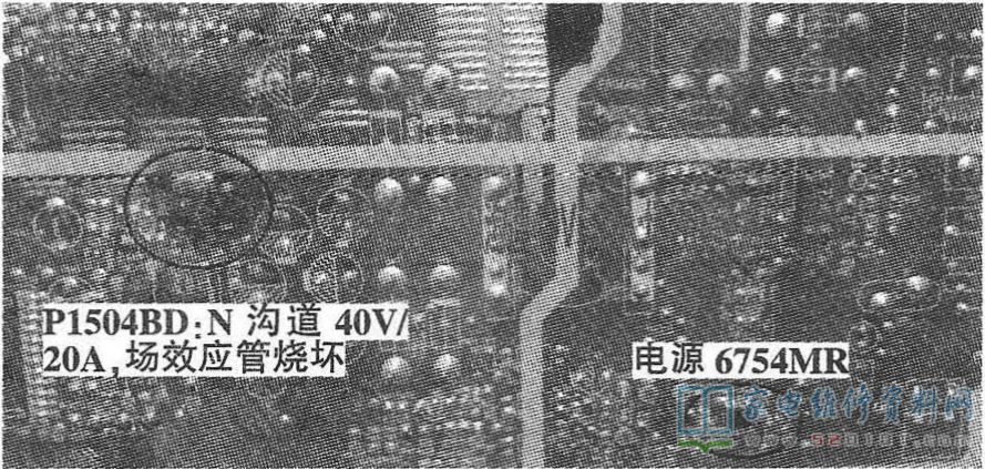 查阅场效应管的参数,P1504这两个管要以后缀型号来辨认-P1504BDG ,N沟道,40V/20A;P1504EDG,P沟道,-40V/-45A,根据印制板的电路分析,此管应是TO- 252封装的一只N沟道场效应管。原来印制板的安装位已烧炭化,找了只TOP-220封装的RFP50N06(50A/60V的N沟道场效应管)代换,把炭化的印制板处理干净,直接焊接上位置刚刚合适,如图1所示,通电试机一切正常。