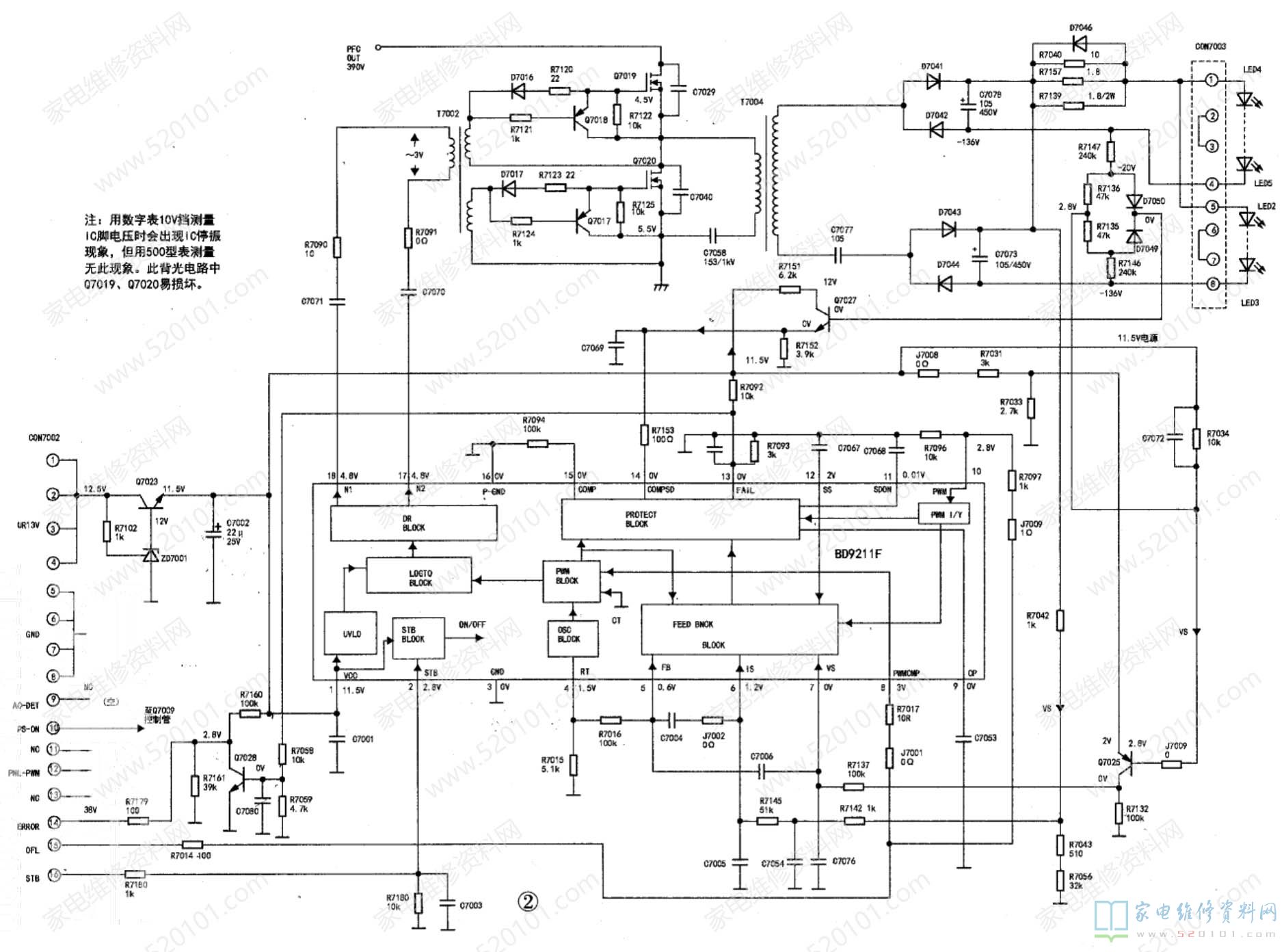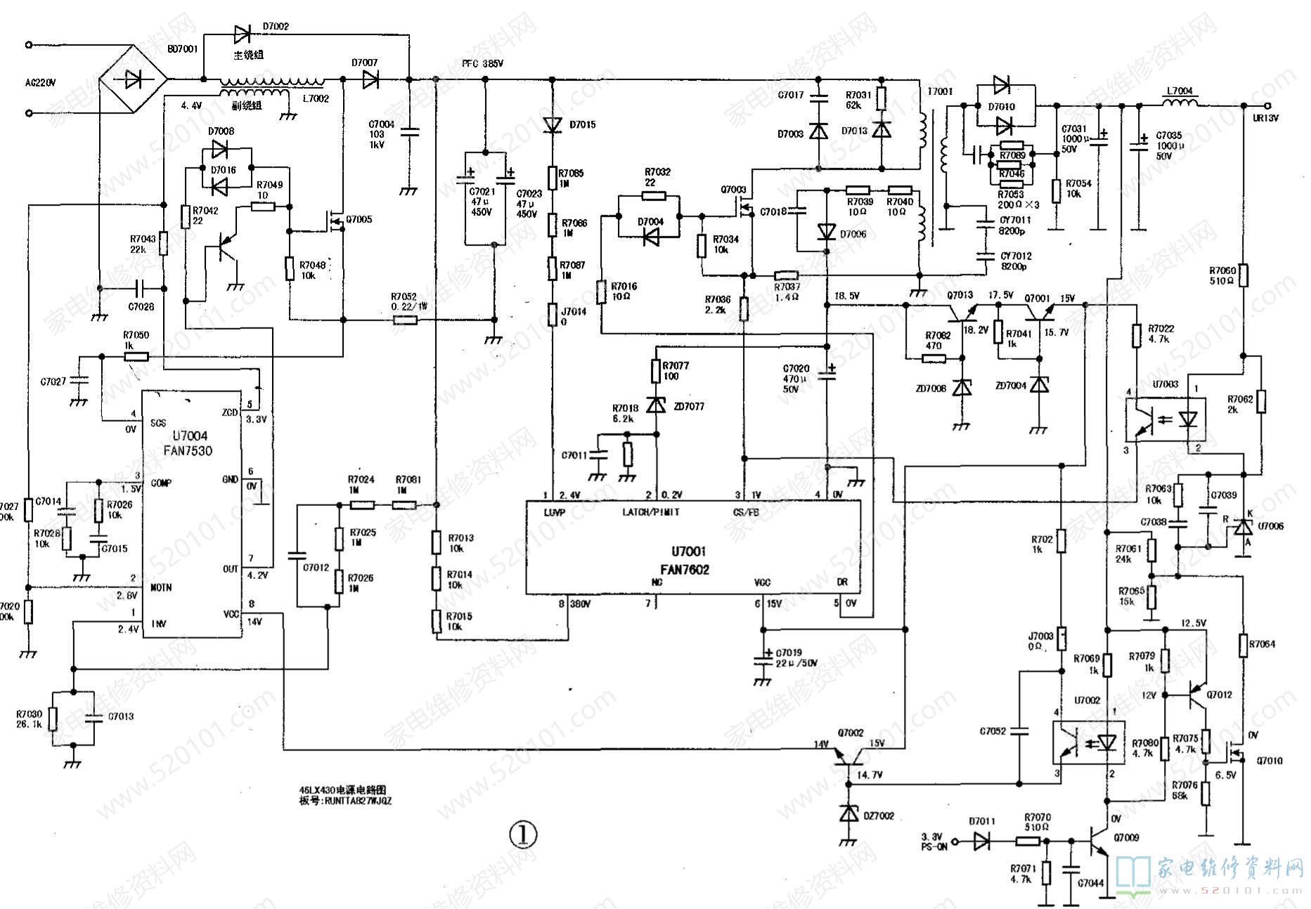 因为该机的屏幕尺寸大,整机耗电量超过100W ,因此按国家规定设计有PFC电路,PFC电路U7001芯片采用了8脚FAN7530, 主开关电源U7002芯片为FAN7602,背光芯片U7003为BD9211F。