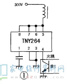 接修一台夏普LCD-40E66液晶电视,该机开机切正常,不到20分钟自动关机,声光全无,待机电源灯也不亮,再过10分钟又自动开机,但工作时间更短。根据情况判断故障因元件发热所致。开盖,目测电源板无异常,冷开机工作时间比开盖前长一些,自动关机后测副电源无5V输出。手感副电源芯片TNY264较热,再次自动开机后手摸TNY264表面感觉温度在慢慢升高,再过一会儿有点烫手,接着关机了。在芯片表面用704胶粘上一块散热片后开机,散热片温热,当时气温约40°C,连续开机2小时机器一直正常,以为故障为机器散热不良所致,交付用户。仅过二十多天该机又返修,故障相同且更严重,开机仅5分钟就关机,当时气温已回落至30°C,如此看来可能有软故障元件。TNY264芯片外围电路很简单(见图1),查光耦①脚电容完好,把TNY264 (输出功率9W)换成TNY266(输出功率15W),连续开机4小时机器均正常。