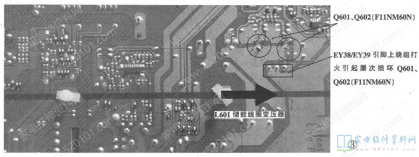 仔细排查电源板上PFC部分的元件,除了Q601、Q602( F11NM60N )外,没有发现其他元件有问题,F101保险管不安装并换上新的MOS管后试机,在原保险管引脚两端的印制板上焊接一只220V/60W灯泡,通电后灯泡很亮,难道待机的副开关电路有故障?正准备测量电源板上电压时,闻到有煳味并有冒烟现象。断电检查发现PFC电路的储能线圈L602 (0299AF SC-0905S12C )还有余烟从EY38端的引脚处冒出,测量新换的PFC MOS管12N60已经击穿,如图1所示。