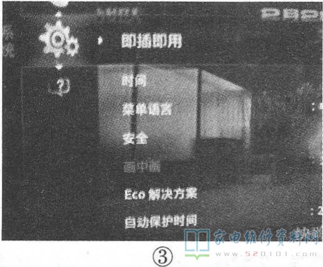于是查看所有菜单,发现有说明书一项( 该机把使用说明书存在机内程序存储器内),仔细研究说明书发现本机现在是处于商场展示模式,该模式下为取得亮丽的图像效果,背光和对比度都为最大值,如果有顾客调试过电视机模拟量,每过30分钟就自动恢复为商场模式设定值。