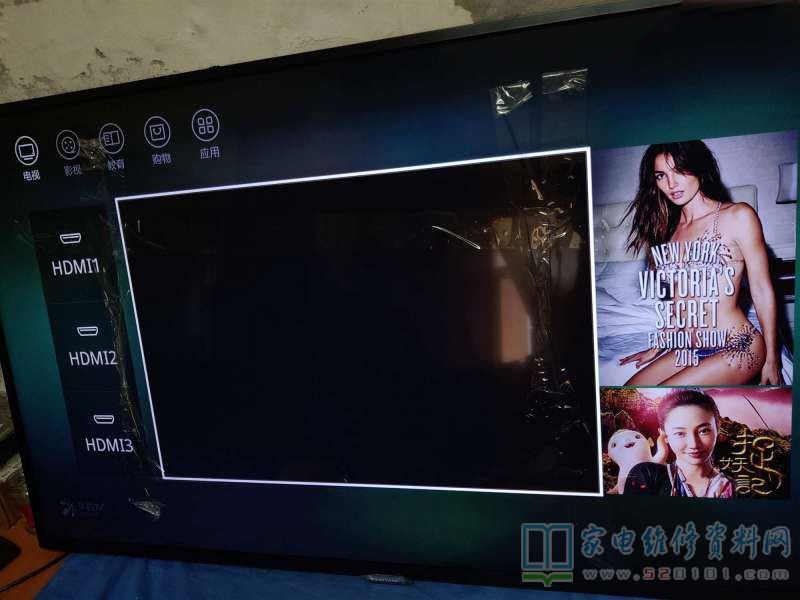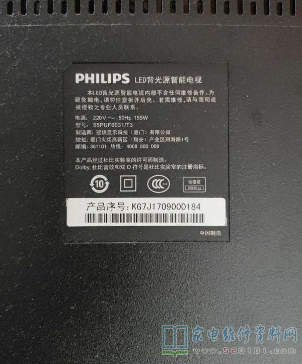 最近一朋友说家里的电视坏了,搬来后一看是一台飞利浦液晶电视55PUF6031/T3的,通电试机,开机启动到LOGO处一闪而灭,看现象懂行的应该能猜到大致的故障范围。拆机,万用表测试灯条两端电压,上到70v然后慢慢下降到25v,至此判断灯条有开路。