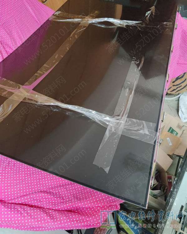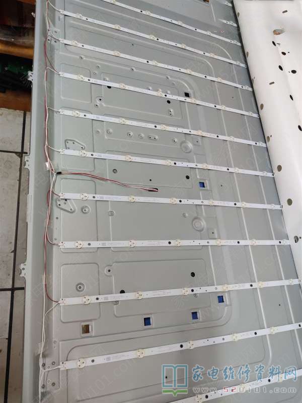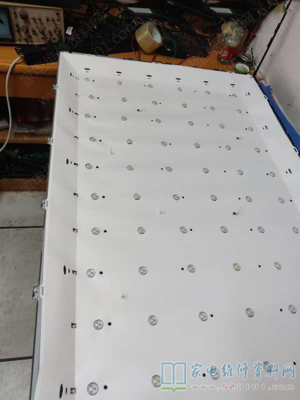 以前真的没有拆过这么大的屏,禁不住朋友的死磨硬泡,同意看看,半开玩笑说拆坏了直接扔垃圾堆了,朋友也让我放心搞,然后就是仔仔细细的一番折腾,取屏器没有,直接用胶带纸伺候,拿开液晶屏后,再仔细地拿开均光板后,就到最底层的灯条了,取下螺丝露出灯条,一共是三路,每一路为三根串联,六只灯粒,一粒是3v,每路就是54v,检查后发现有两根灯条灯粒有开路,更换后试机一切正常,拆屏还是那句话一定要仔细再仔细。