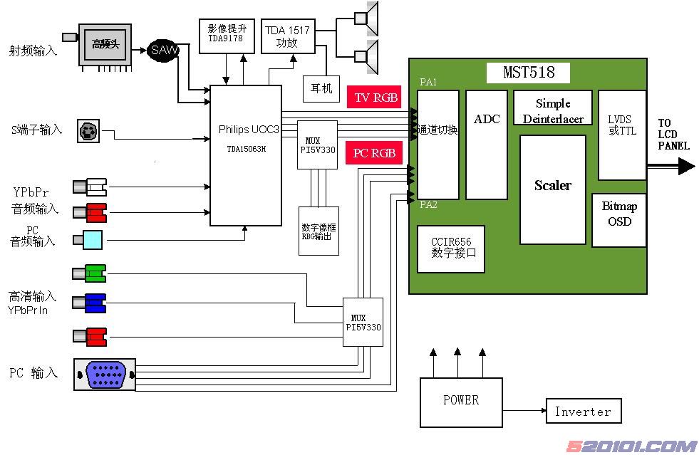 主板组件是液晶电视中信号处理的核心部分,在系统控制电路的作用下承担着将外接输入信号转换为统一的液晶显示屏所能识别的数字信号的任务。主板组件包含两大部分信号处理模块:以Philips UOC3为主的模拟音、视频电路,以MST518为主的VGA电路、信号格式变换系统控制电路。前一功能模块分别将高频头输出的图像中频和声音中频转换成RGB三基色模拟信号和音频信号,这部分叫作音、视信号模拟解码过程。MST518接收UOC输出的RGB三基色先进行模数转换,最终输出适合液晶屏驱动电路要求的数字基色信号。UOC内置8051处理器还负责协调系统各部分的工作,并对用户通过控制面板(按键板组件)进行的操作作出响应。