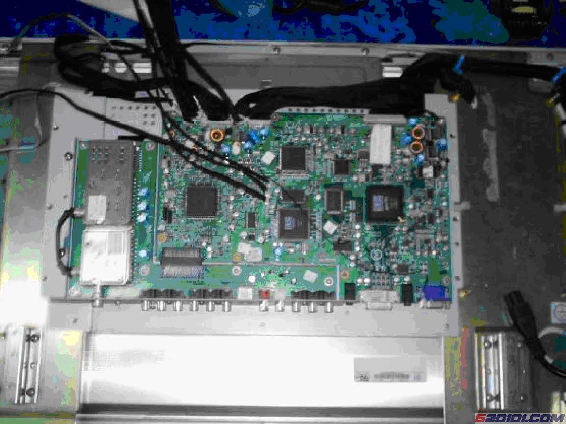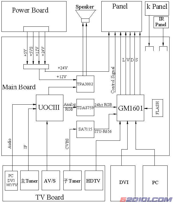1 主板组件 主板组件是液晶电视中信号处理的核心部分,在系统控制电路的作用下承担着将外接输入信号转换为统一的液晶显示屏所能识别的数字信号的任务。TV 板输入的TV 和AV 信号在UOCIII 中进行音视频解码后输出的RGB 基色信号经过TDA8759 模数转换,输出24bit 的RGB 数字信号通过GM1601/GM1501 格式变换等处理后产生LVDS 信号再上屏显示,另外经VGA 、DVI 端子输入的信号则直接进入GM1501 处理、格式变换和上屏显示。