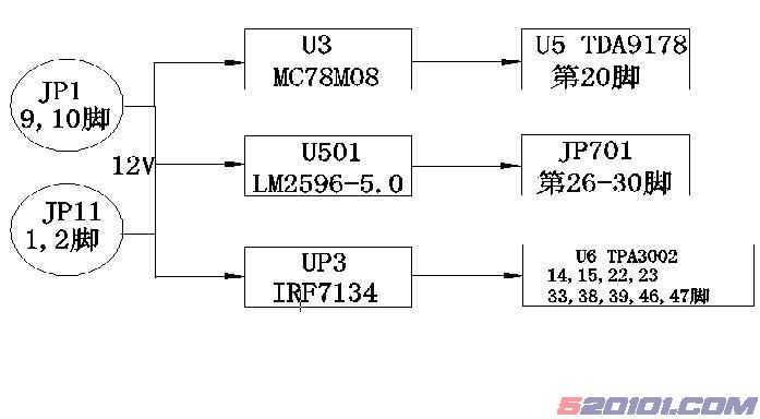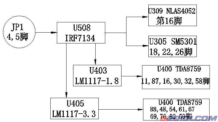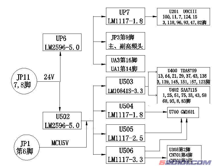 从电源板共有4 路电压输出,+24V,+12V,+5V 和+5VS 。其中+24V 供LCD 屏的逆变器使用,+12V 供功放使用,+5V 通过DO( 如LM1117 、LM1084 等)变成3.3V、2.5V 和1.8V,供IC 使用,在待机状态下会被关断,而+5VS 则供MCU 、红外接收器、EEPROM 等供电
