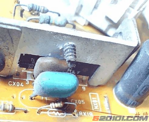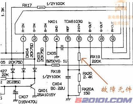 故障检修:检查和代换场扫描电路相关元件,一无所获。后搜索浏览相关资料,得知此故障是该机通病,病因为视放电路电阻RX19(220K)阻值变大或开路所至。检查RX19,果然阻值变大为300K以上,换新试机故障排除。