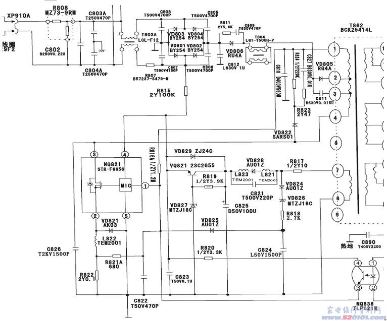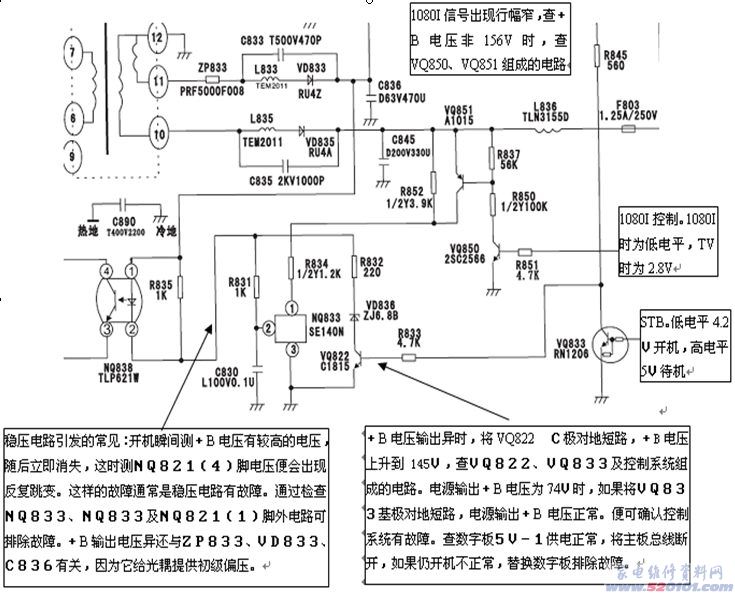 3、2脚过流检测、5脚反馈稳压电路、误差检测NQ823。NQ823使用SE140时,+B输出145V。使用SE125时,+B输出125V,SE115输出+B115V。