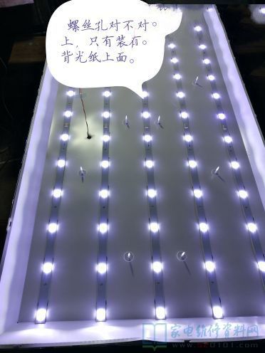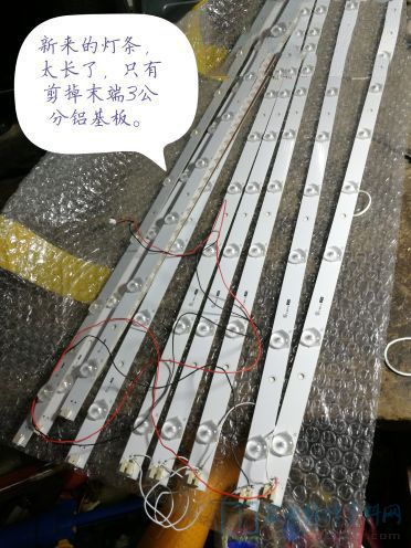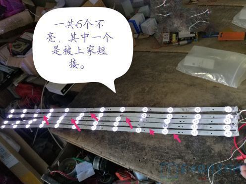 首先电视开机观查一下,有开机音乐声而且已显LOGO标志之后立即黑屏,用强光手电点有较清晰的无信号三个字左右移动,应该背光灯珠损坏。折机取屏,当露出灯珠时发现灯珠被上家维修人员取掉一个灯珠,非但不换而且直接用焊锡短接。用背测试仪测试一共有6个不亮,一共60个灯珠,相应十分之一,本着对自己负责,对客户负责,决定买整套灯板安装。网上搜索发现广州有一家一模一样的也不用改线,决定拍下。下午到货,傍晚静下心来慢慢维修,白天就怕人多磕磕碰碰,很危险。